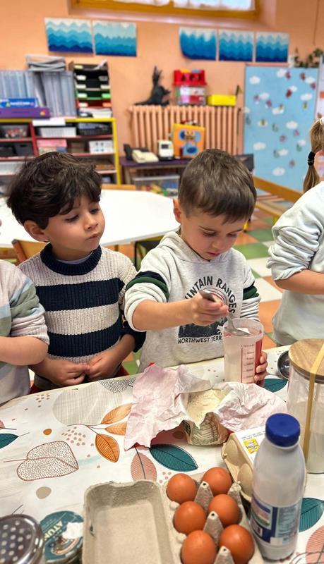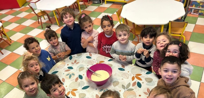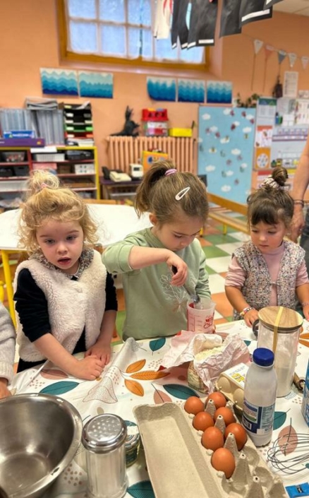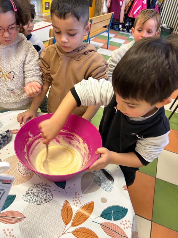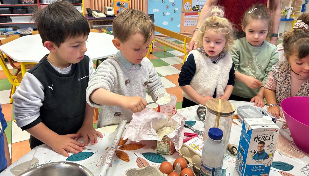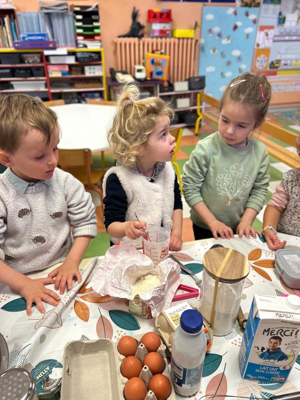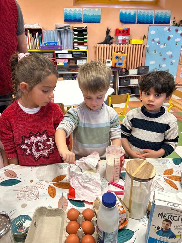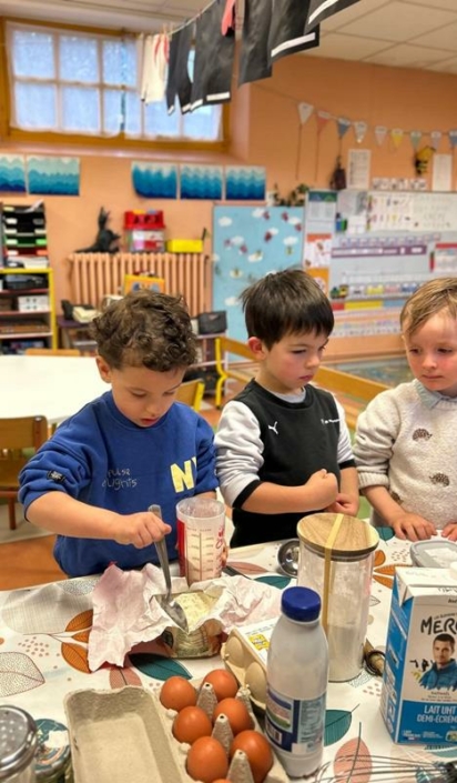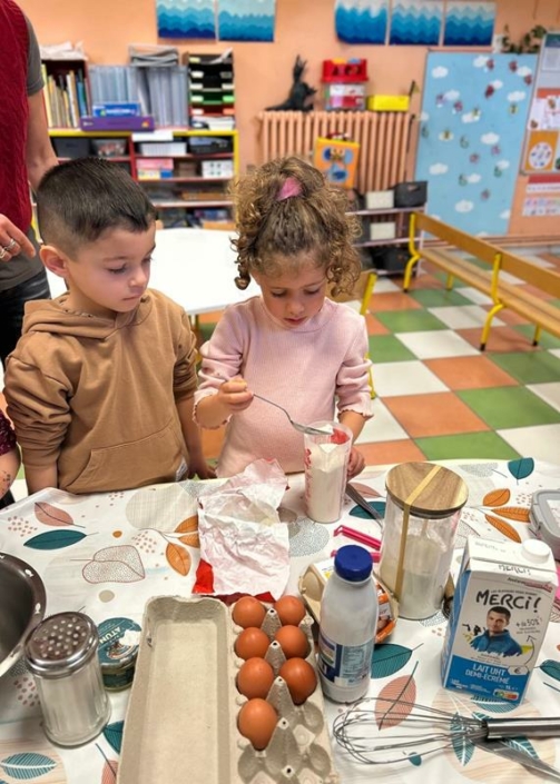 Guidés par leurs maîtresses, les enfants ont découvert le plaisir de mélanger les ingrédients : la farine, les œufs, le lait… Chaque étape était une occasion d’apprendre et de s’émerveiller. Les petits doigts ont savamment cassé les œufs (parfois avec un peu d’aide !), mélangé la pâte avec application, et observé avec fascination la transformation des ingrédients.